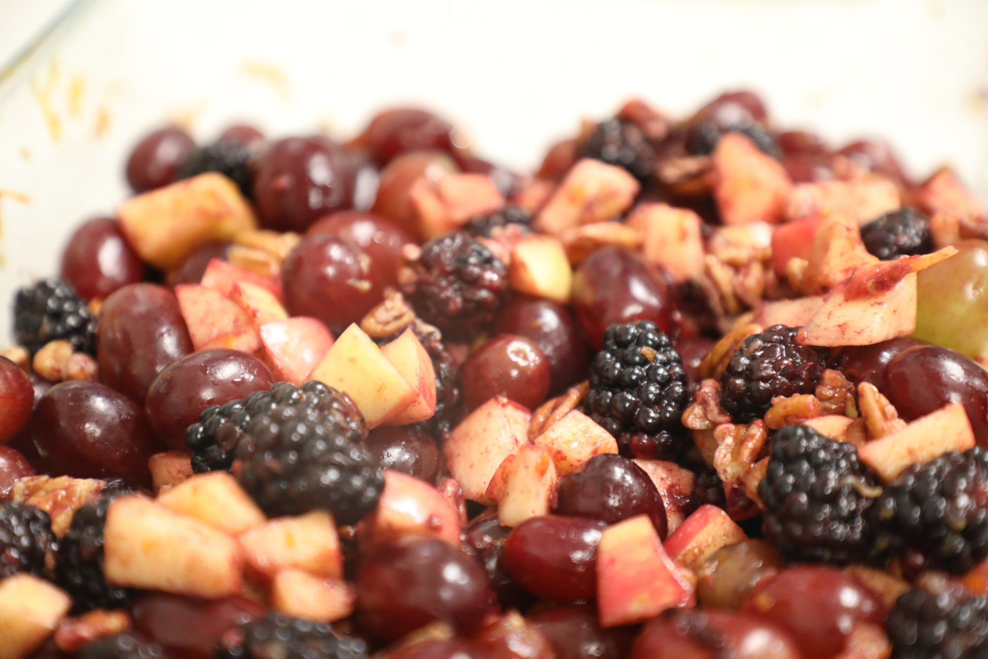 In a large bowl, add the zest and juice of one orange. Then, add maple syrup and cinnamon, whisking to combine. Then, add grapes, blackberries, and pecans. Cube apples into bite-size pieces and add to the bowl. Immediately toss to coat fruit. Serve immediately or store covered in the refrigerator until ready to serve.