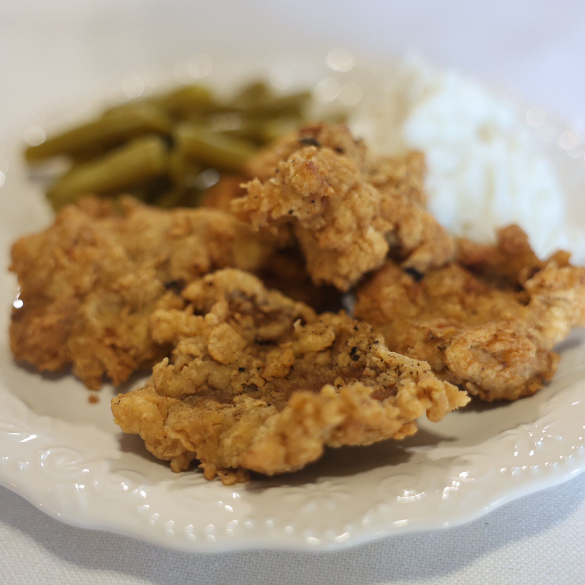 Gently lay about 4-5 pieces of meat in the pan leaving room between the pieces to keep the oil hot. Flip when the bottom side is golden brown, and fry until both sides golden brown.